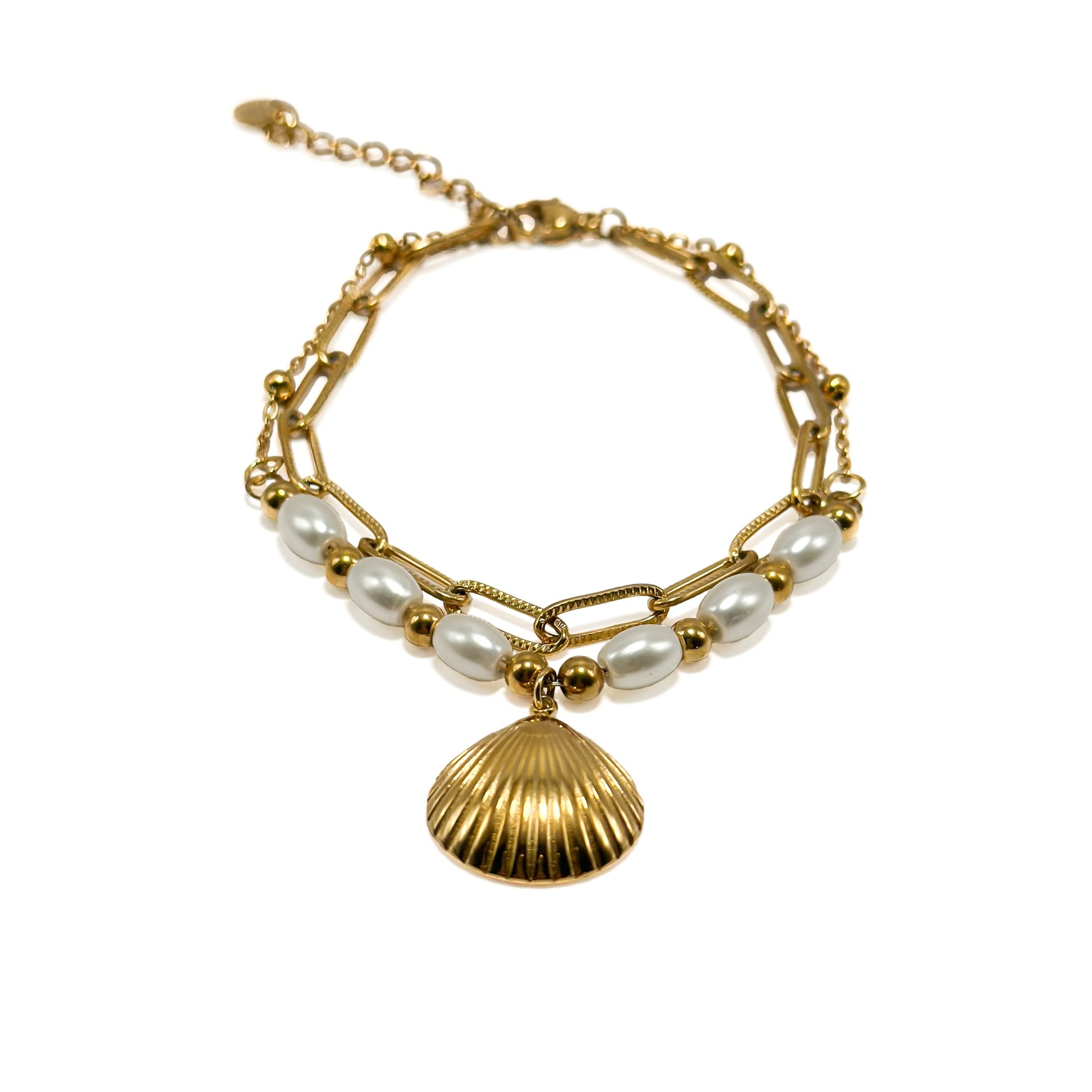 Double bracelets, for twice the fun. A pretty sea-inspired charm, some pearls, and you have the perfect bracelet.